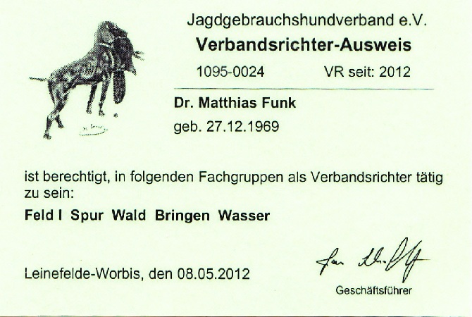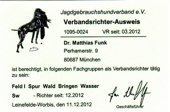 Es ist faszinierend einen gut ausgebildeten Hund bei der Arbeit zu sehen. Insofern beschloß ich mich intensiver mit deren Ausbildung auseinanderzusetzen und schloß nach bestandener VGP die insgesamt einjährige Ausbildung zum Verbandsrichter des JGHV an, welche ich 2012 erfolgreich ablegte. Ebenso habe ich die Ausbildung zum Verbandsrichter-Sw, welcher zur Abnahme von VSwPen und VFSPen berechtig und ein weiteres halbes Jahr Ausbildung in Anspruch nahm, im Dezember 2012 abgeschlossen.
