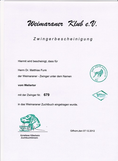 Der unter der Nr. 679 in das Weimaraner Zuchtbuch
